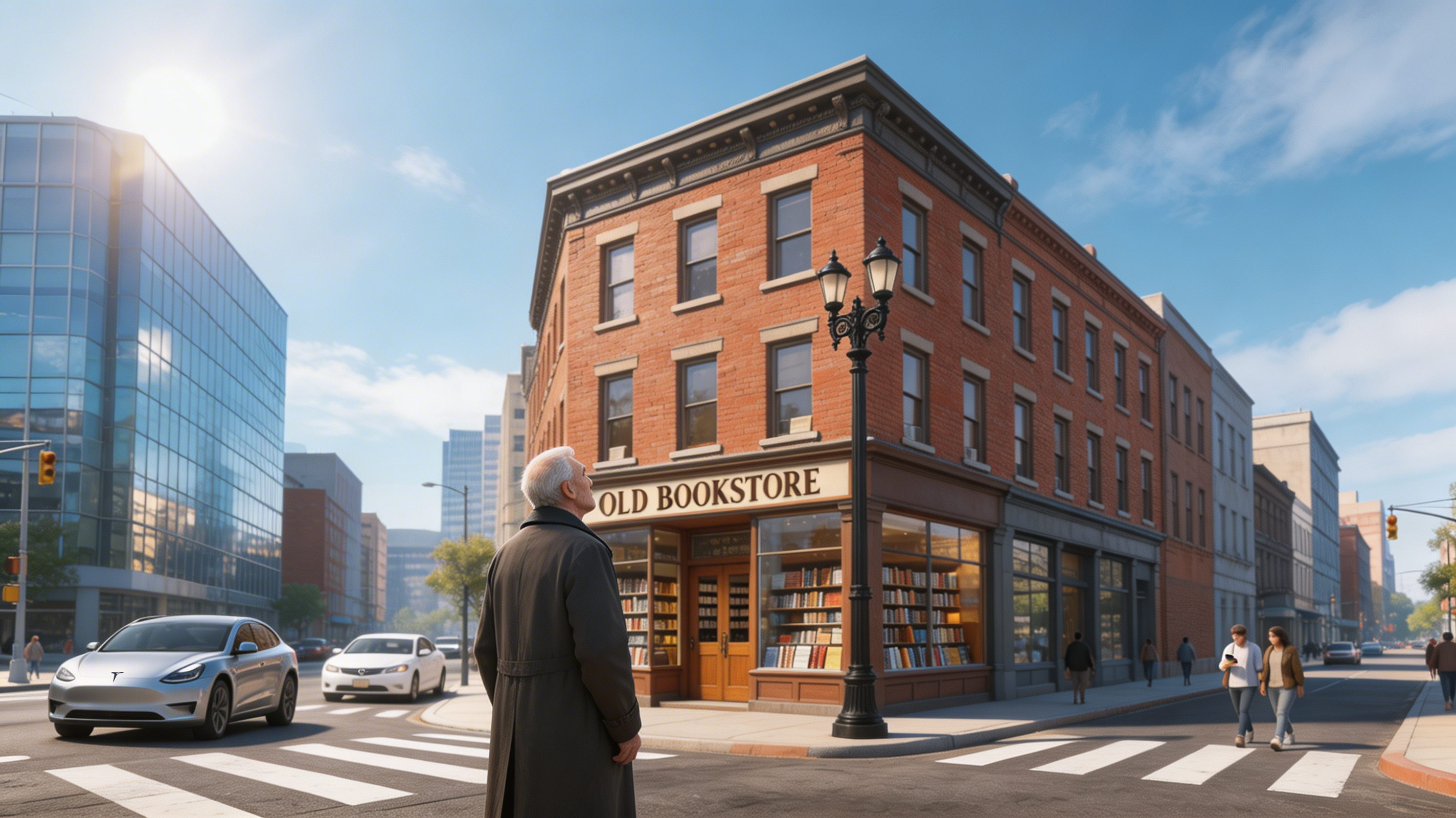 "prompt": "Fixed camera on the same corner. Opens in the modern city with an elderly man at the curb. Light warms; modern cars morph into classics; glass tower becomes brick; bookstore sign turns retro. The man grows younger—hair darkens, trench becomes a vintage suit. Ends in the 1950s with the young man smiling into the distance. Smooth, cinematic, film-like color.",