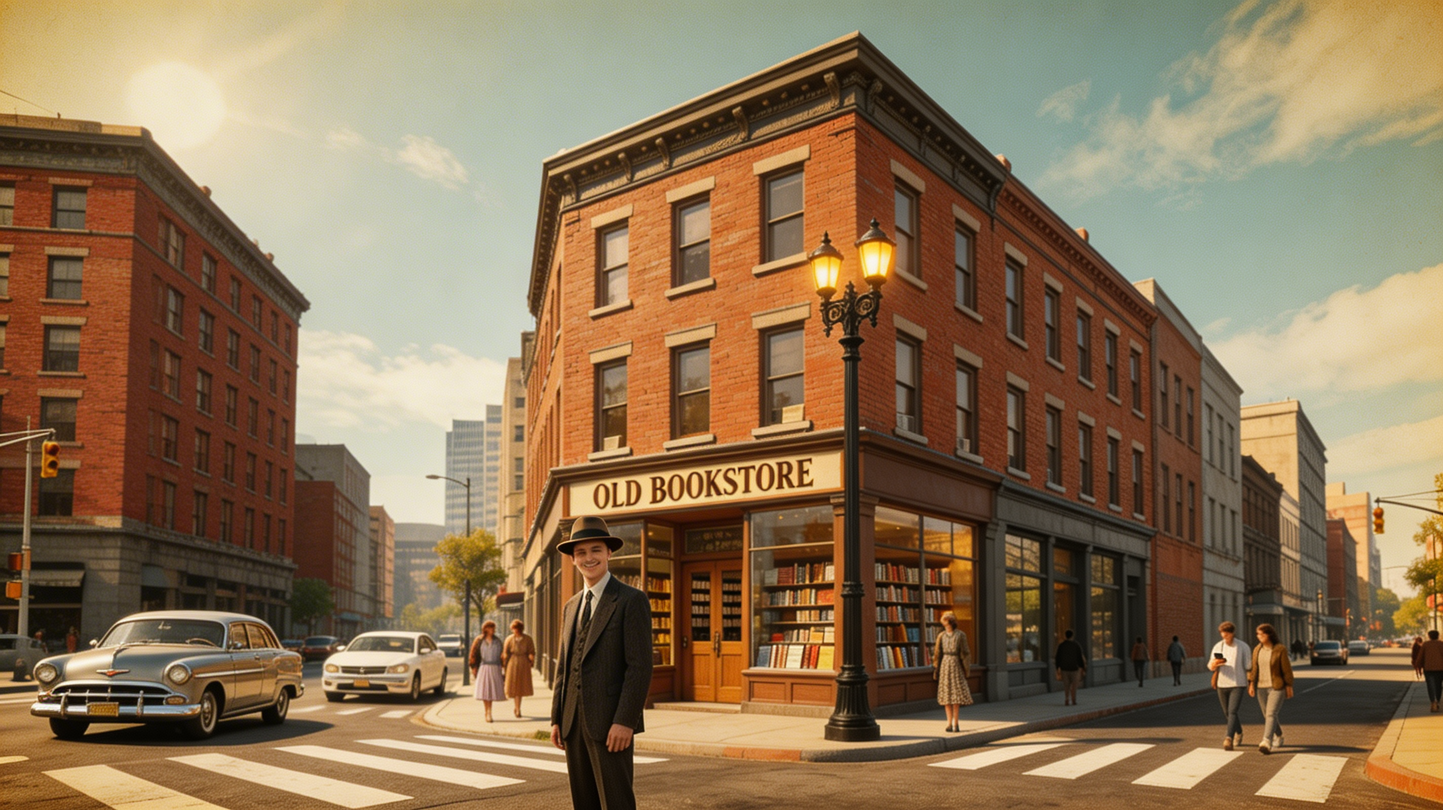 "prompt": "Keep layout, angle, and light direction the same. Shift the scene to the 1950s: bookstore sign in retro lettering; lamp unchanged but warmer glow; glass tower reads as brick. Add a 25-year-old man in vintage suit and hat, smiling. Replace cars with classic 1950s (e.g. Chevrolet Bel Air). Warm yellow grade, film texture.",