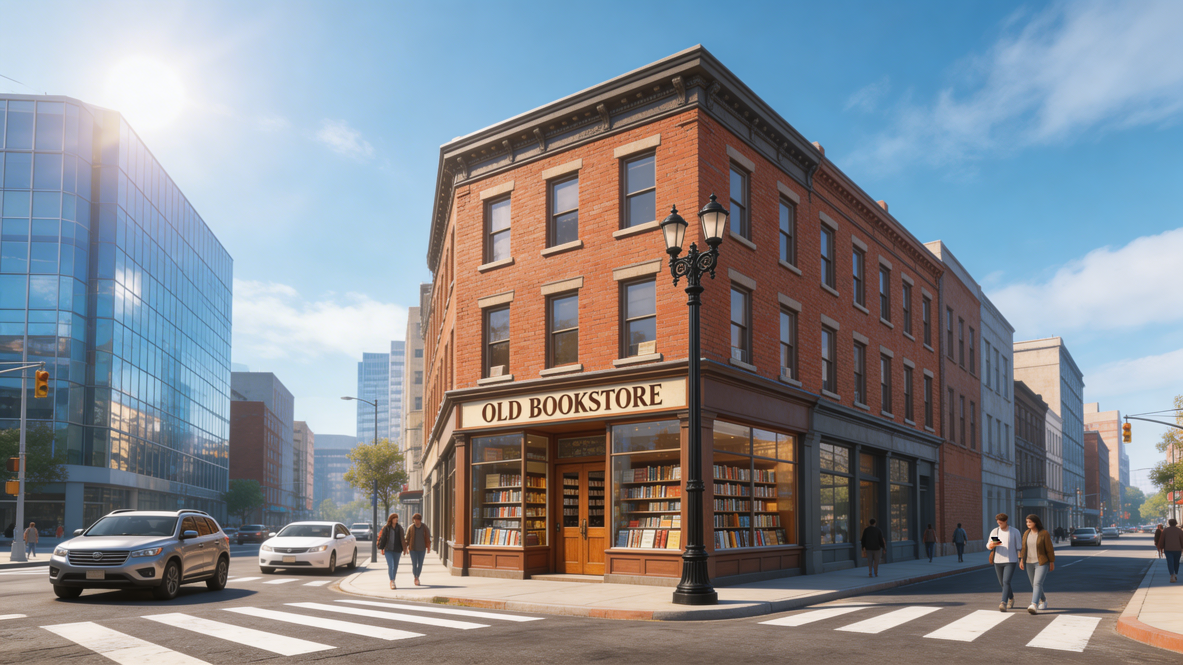 "prompt": "A modern city street corner on a sunny day. A red-brick wedge building on the corner with an old bookstore on the ground floor and a vintage street lamp beside it. Across the street, a glass curtain-wall office tower. Modern cars and pedestrians on the road. Centered composition, 16:9 landscape, photorealistic, ultra sharp.",